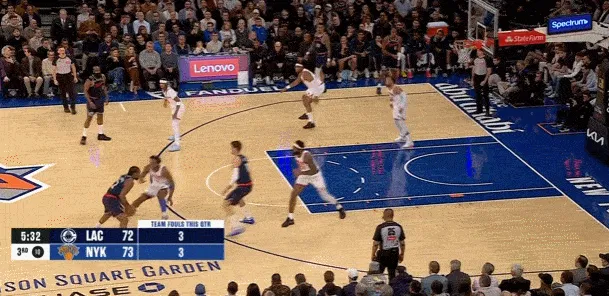 这一回合发生在第三节剩下5分半之前,当时伦纳德绕与大洛佩斯挡拆,面对米罗防守,运球到底线附近出手中距离,球是进了,但是伦纳德在后退过程里被场边球迷不小心垫到,回防跑动时明显不太对劲。