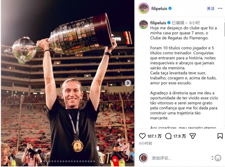 3月4日讯 弗拉门戈官方宣布主帅费利佩·路易斯离任,费利佩·路易斯社媒发文,与俱乐部告别。费利佩·路易斯写道:“今天,我告别了7年来视之为家的俱乐部——弗拉门戈。作为球员,我在这里赢得了10座奖杯,作为教练,我在这里5次夺冠,这些成就载入史册,那些难忘的夜晚和拥抱将永远铭刻在我的记忆中。每座举起的奖杯都凝聚着汗水、努力、勇气,最重要的是对这枚队徽的爱。感谢俱...